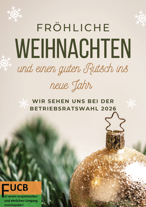 Weihnachtsgruß vom FUCB Betriebsrat Dezember 17, 2025Januar 1, 2026 Der Freie unabhängige christliche Betriebsrat wünscht allen Kollegen und Kolleginnen eine fröhliche und besinnliche Weihnachtszeit im Kreise Euerer Lieben.
